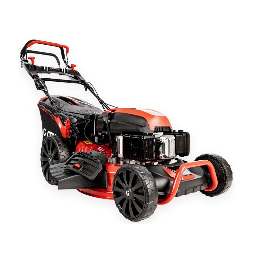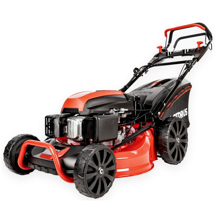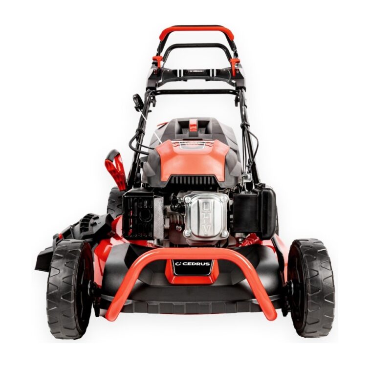 Kosiarka spalinowa CEDRUS KS53SV-E to model wyposażony w napęd oraz elektryczny rozrusznik. Posiada silnik o mocy 5.7 KM, kosz o pojemności 65l ze wskaźnikiem napełnienia, centralną regulację wysokości koszenia w zakresie 25-75 mm, złącze do mycia podwozia kosiarki. Obudowa układu koszącego wykonana jest ze stali, a jej szerokość robocza wynosi 53cm. Na uchwycie zamontowane są dwie dźwignie: jedna służy do regulacji obrotów silnika, druga to dźwignia ssania. Łatwość manewrowania zapewniają duże tylne koła oraz dobre wyważenie maszyny. Wszystkie koła są łożyskowane.