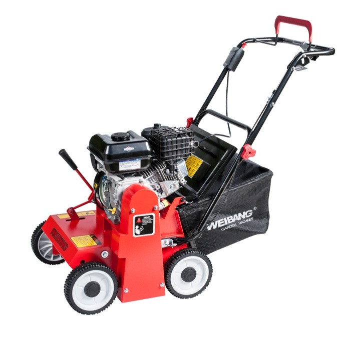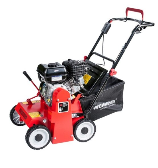 Wertykulator spalinowy Weibang WB384 RB z silnikiem Briggs&Stratton 5 KM to profesjonalne urządzenie do trawy z 22 uchylnymi nożami, regulacją głębokości, koszem 40 l.